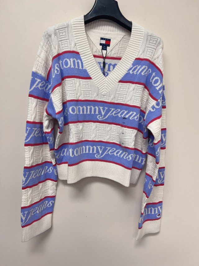 Tommy Women Jeans Logo Stripe V-neck Sweater L