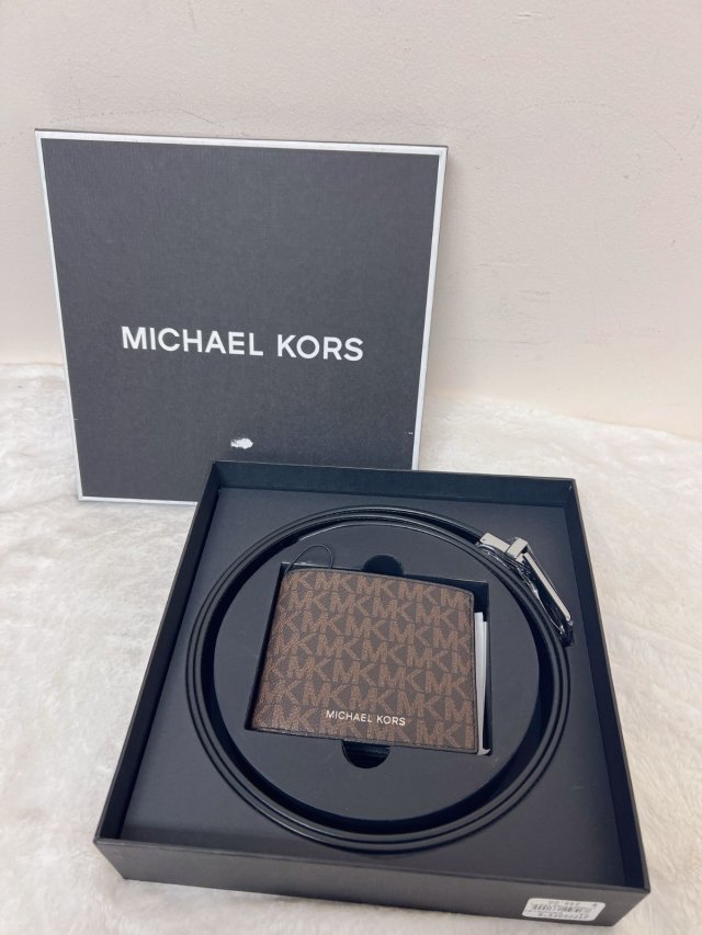 MK Men Billfold Wallet and Belt Gift Set Brown Logo