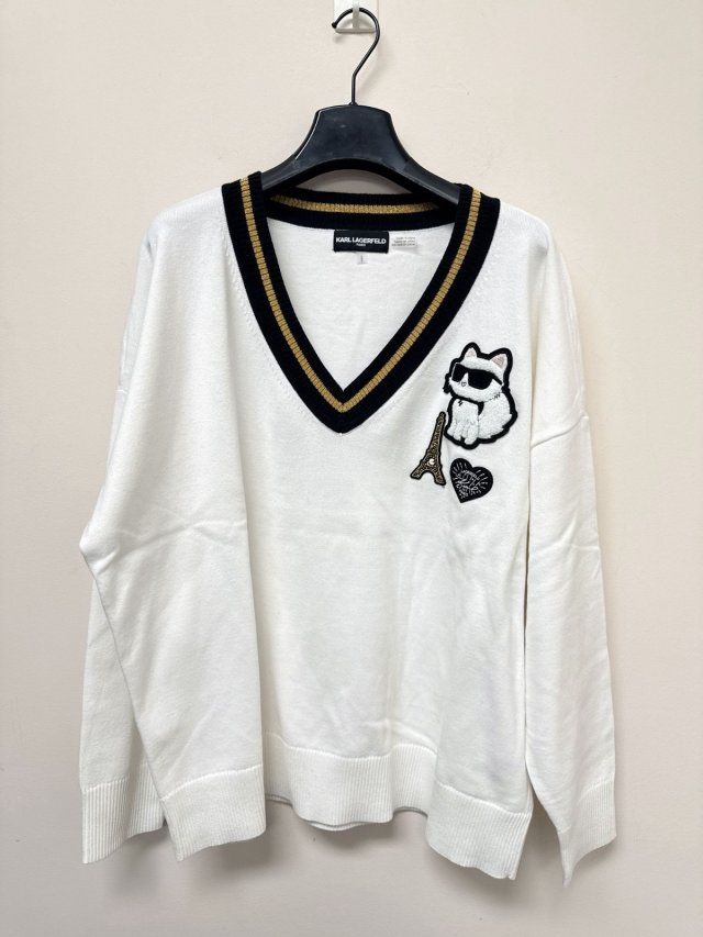 Karl Women Cat V Neck Sweater White S706