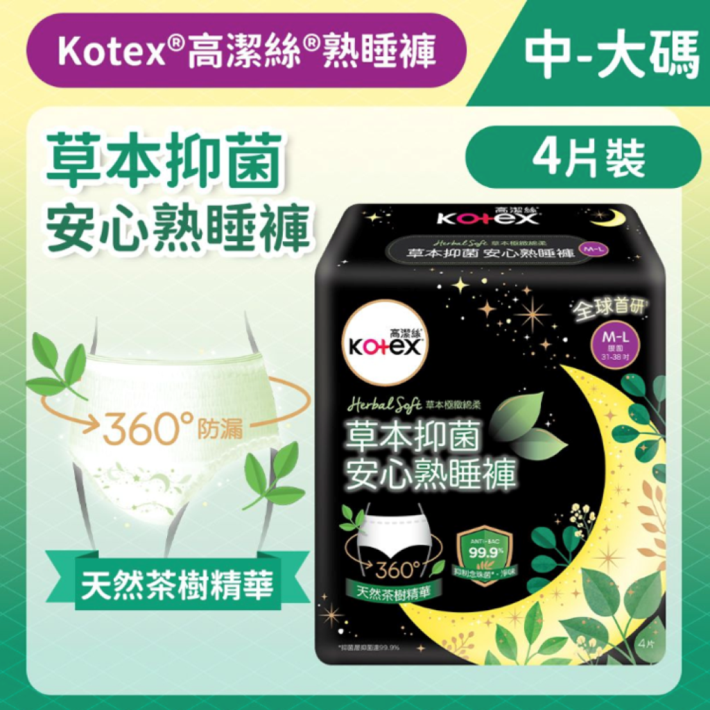 主頁 <$100 4 件任揀 > Kotex 高潔絲 草本抑菌 安心熟睡褲 M-L