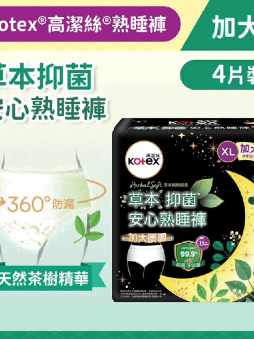 <$100 4 件任揀 > Kotex 高潔絲 草本抑菌 安心熟睡褲 XL