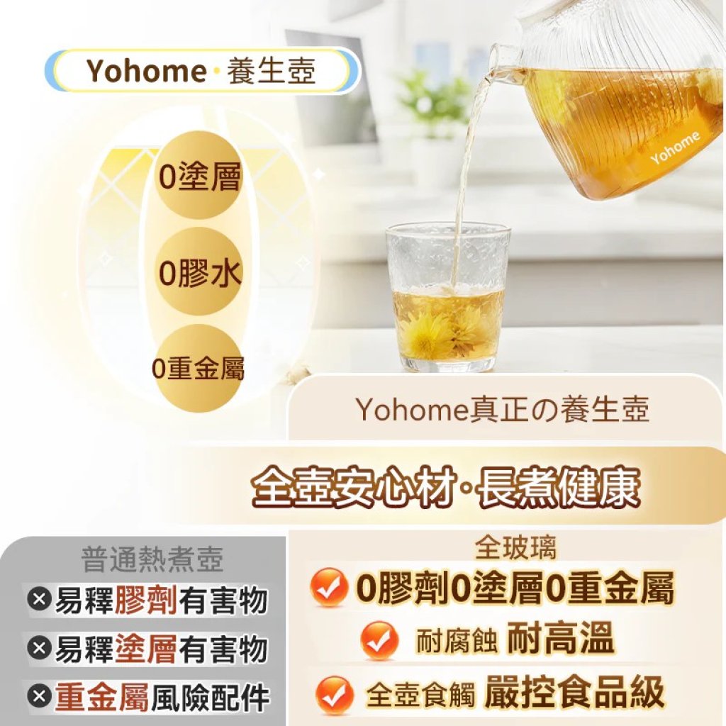 1.全玻健康材更安心: 壺身一體成型高硼矽玻璃,0塗層/0膠水/0重金屬,飲水更健康。