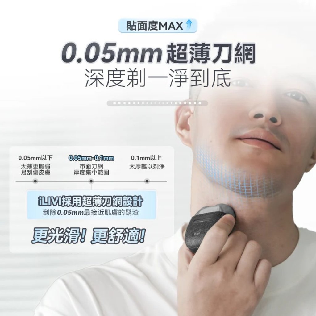 2、0.05mm超薄弧面刀網貼合剃須更乾淨,敏感肌膚、痘痘肌膚也可舒適